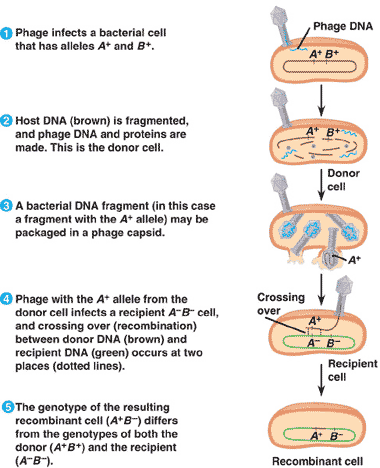 | A method for recombination in bacteria in which a virus carries bits of DNA from one bacterium to another. | transduction,  |