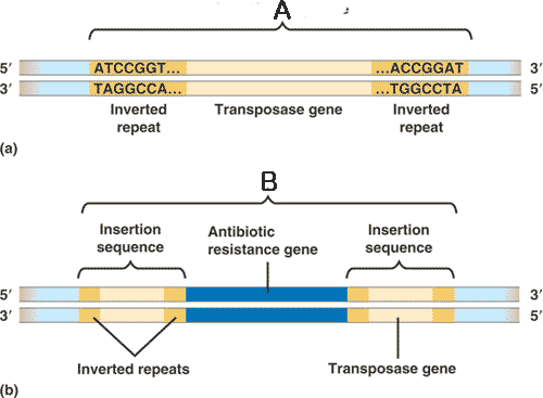 What is "B" in the picture below?,  | a transposon ("jumping gene"; They include extra genes that can transpose themselves into other parts of the genome, including the plasmid. This can be beneficial if the extra genes encode antibiotic resistance. Once in the plasmid, they can easily be transferred to other bacteria via conjugation. Eukaryotic organisms also have transposons),  |