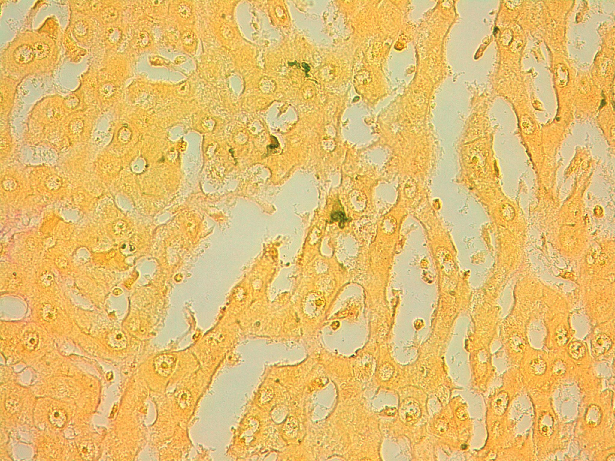 The substance staining emerald-green seen here is:,  | bilirubin |