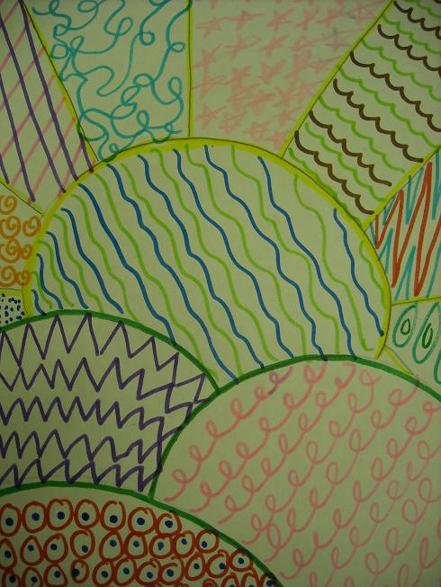 We started the year learning about the first element of design--line, and created line landscapes. First, students outlined shapes of mountains, hills, and fields, and filled in each shape with a variety of lines. Lines were repeated to create patterns.