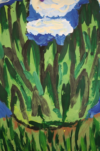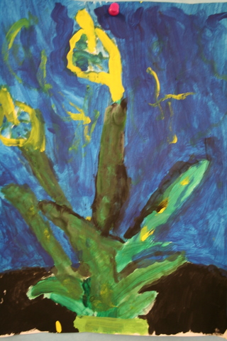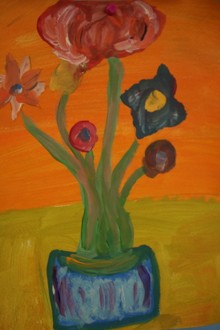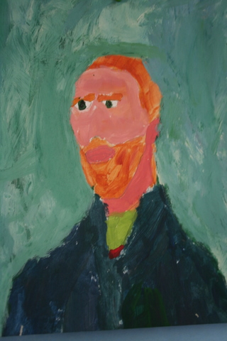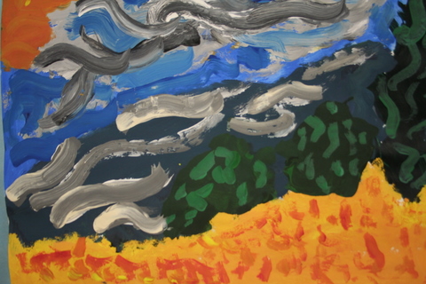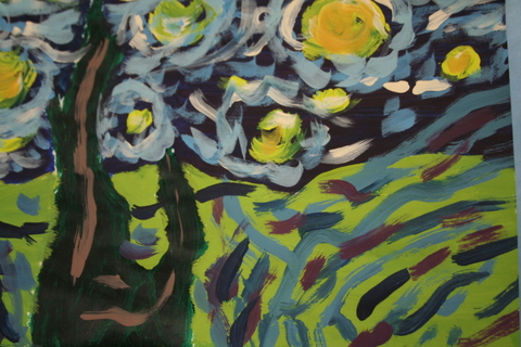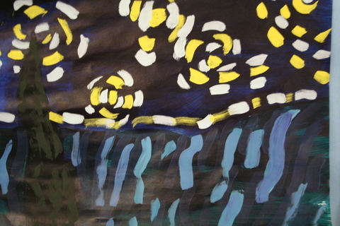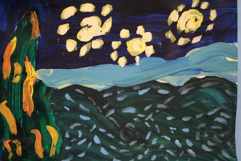 VAN GOGH (2009) ~ Fifth graders chose one of Vincent Van Gogh's paintings and painted their own version of it, making TINTS by mixing white paint with a color, and SHADES, by mixing black paint with a color. They painted the background first, then mixed colors and used short brush strokes to create texture in Van Gogh's style.