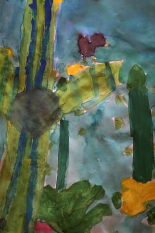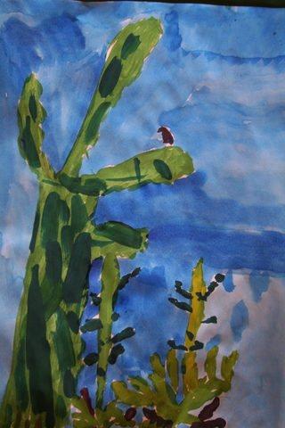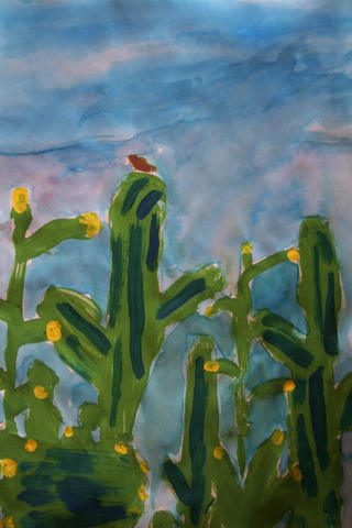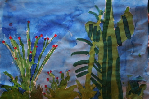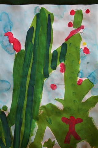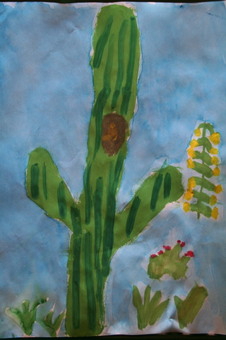 Second graders have studied line and drawn line animals, learned about color and used oil pastels to color a color wheel, created and decorated with Indian designs clay pinch pots, painted a Christmas tree, chose a Catholic Icon to draw then paint, painted a desert scene focusing on desert plants, learned about artist Georges Seurat and Pointillism, and practiced drawing three-dimensional forms which satisfied the following Diocesan standards: Strand 1, C-1, PO-a (line in art), b, (color in art), and d, (form in art) C-3, PO-1 (drawing), PO-2 (painting), PO-3 (printmaking), C-4, PO-a (sculpture). Also, Strand 2, R-1, (understand and appreciate the place of art as it reflects our Catholic beliefs) and Strand 3, E-1, PO-a (explore relevancy to Catholic faith). C-5, PO-a, PO-b (safety and care of art materials); Strand 2, R-1 (understand place of art in historical and cultural context).