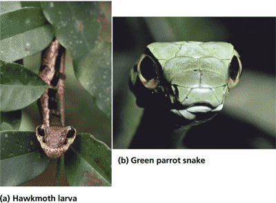 | In ______ mimicry, a tasty harmless organism evolves to look like an unpalatable (yucky), poisonous, or dangerous organism. | Batesian mimicry (like the hawkmouth larva that has evolved to look like a snake which gives it an evolutionary advantage for survival),  |