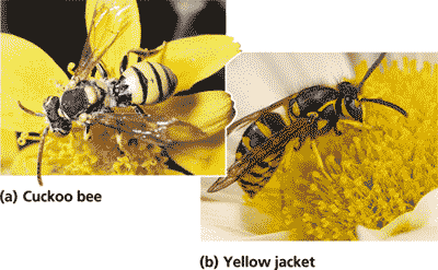 | In _____ mimicry, two harmful species evolve to look more like each other, ensuring a greater survival rate as it becomes easier for predators to remember to avoid them. | Mullerian mimicry (like the bee and the yellow jacket in the picture below),  |