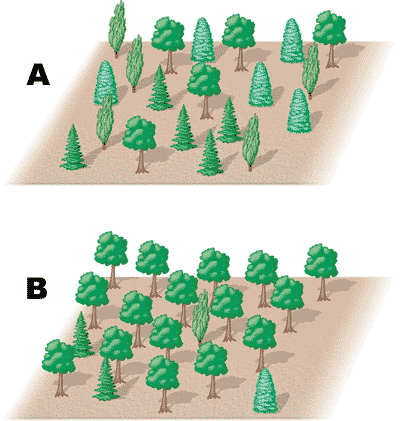 Which forest below demonstrates the greatest diversity?,  | Forest A (Although both forests have the same species richness, the relative abundance in forest A is more balanced, giving it an overall higher rate of diversity),  |