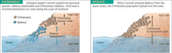 The diagram below shows the difference between brown barnacle's _____ niche (shown on the left) and its _____ niche (shown on the right),  | realized niche (left) vs. fundamental niche (right),  |