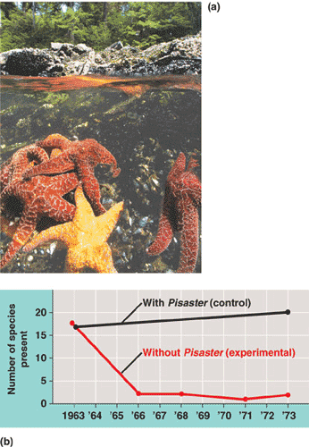 The graph below suggests that the seastar Pisaster ochraceous is a _____ species in tidepool communities.,  | keystone species (The seastar Pisaster is a predator of a mussel called Mytilus californianus which is a dominant species. As long as the Mytilus mussel population is kept in check by the seastar, other species can live in the area. But left unchecked, the Mytilus mussel will outcompete most other species for space in the intertidal zone, lowering the biodiversity of the community as the graph shows),  |