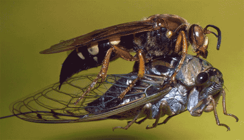 | Parasitism in which the parasite (usually a wasp) lays eggs on or in the body of a living host so that the larva can feed upon and eventually kill the host is called ____. | parasitoidism (In the picture below, a cicada killer wasp is paralyzing a cicada with a sting. The wasp will then lay eggs inside the abdomen of the still living cicada. When the larva hatch, they will eat their way out of the cicada. And you thought you had it rough.),  |