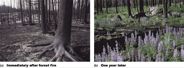 The type of succession taking place in the picture below is _______.,  | secondary succession (After a forest fire, there is still very rich organic soil and probably some trees and seeds that survived. Another example where secondary succession occurs is on abandoned farmland),  |