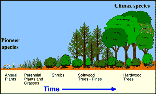 | By altering the soil properties, _______ species permit new plants to grow, and the new plants in turn alter the environment (by providing shade for instance) that allow still more plant species (like shade tolerant trees) to come in and replace the original plant species in a process called ______. | pioneer plant species, ecological succession |
