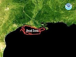 | An area of the ocean, usually near the mouth of a major river, that is too low in oxygen to support life due to excess nutrient pollution from the river, which caused a bloom in phytoplankton that later died and were decomposed by bacteria that used up most of the oxygen in the water. | Dead zone (the picture below shows an aerial view of the dead zone in the Gulf of Mexico) p. 1255,  |