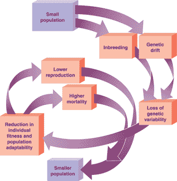 | A downward population spiral in which positive-feedback loops of inbreeding and genetic drift causes a small population to shrink and, unless reversed, become extinct. | Extinction vortex p. 1245 |