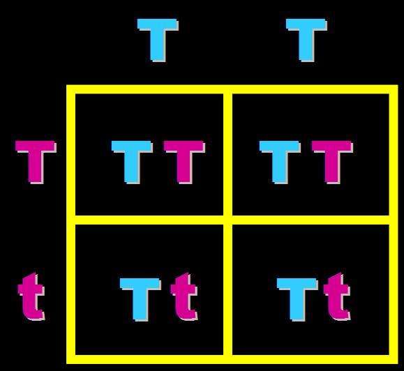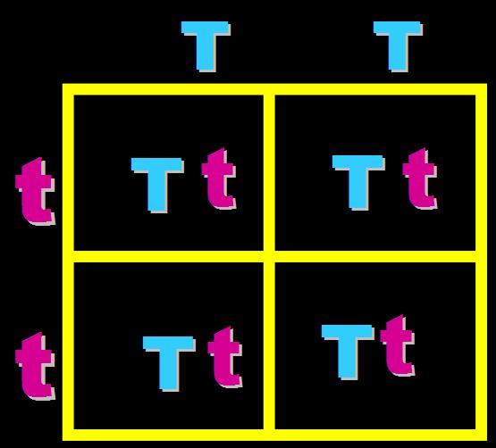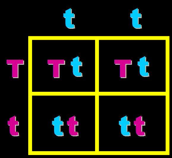 In pea plants, T=tall and t=short. What will the genotypes and phenotypes of the offspring in this cross be? Give the expected percentages.,  | Genotype = 25% Homozygous dominant (TT), 50% heterozygous (Tt) and 25% homozygous recessive (tt) Phenotype = 75% Tall and 25% short pp266&267,  |