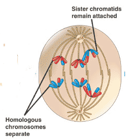 Which stage of meiosis is shown below?,  | anaphase I (Notice that homologous chromosomes are separating, but not the attached sister chromatids) p.254,  |