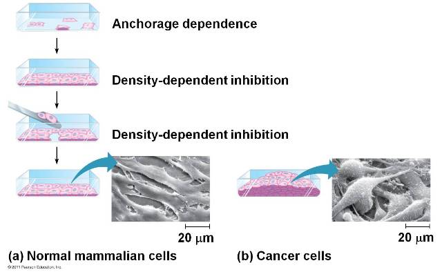 | Density-dependent inhibition is a phenomenon in which _____ cells stop dividing. | crowded (* Cancer cells don't seem to exhibit density-dependent inhibition) p241,  |