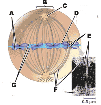 The structures labeled A are,  | sister chromatids (This diagram shows sister chromatids joined only at the centromere, not by cohesin proteins all along the length of the chromatids. Evidently, some species do not have their sister chromatids joined at all points like humans do. See the description of prophase on page 232) p.231,  |