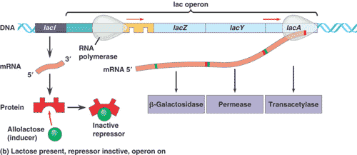 | * A specific small molecule that inactivates the repressor protein in an operon. | inducer (allolactase, an isomer of lactose that occurs in small quantities when lactose is present, is the inducer in the lac operon system because it's presence ends up inducing the operon to be transcribed, making the instructions for making the enzyme that breaks down lactose; lactase, a.k.a B-galactosidase) p312,  |