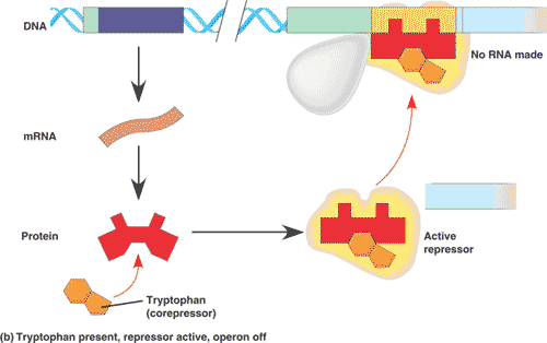 | * A protein that suppresses the transcription of a gene. | repressor (the repressor protein that stops the trp operon is the red molecule. It requires tryptophan as a corepressor to assume its active form) p311,  |