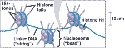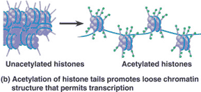 | * What affect does the acetylation of histone tails have on the ability of DNA to be transcribed? | makes it easier (because the acetyl group -COCH3 neutralizes the positive charge of the histone protein, loosening the grip of the histone on the negatively charged DNA. It also loosens their attraction to neighboring nucleosomes) p315,  |