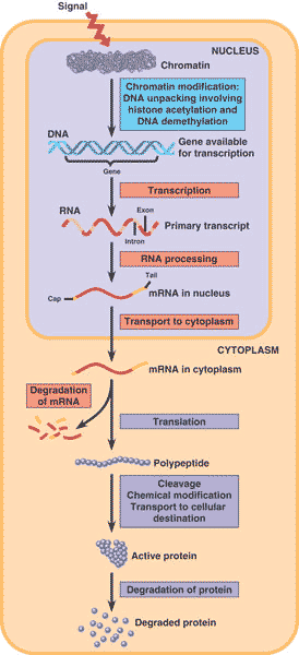 | * In both prokaryotes and eukaryotes, gene expression is most often regulated at the stage of _______. | transcription (As you can see in the figure below, there are other places that gene expression can be regulated) p315,  |