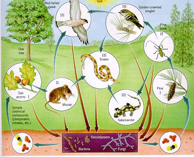| Describe how matter moves in an ecosystem? | Matter cycles through an ecosystem, going from producers to the consumers who eat the producers and eventually to decomposers who change the matter into forms the producers can use, to start the cycle all over again. |