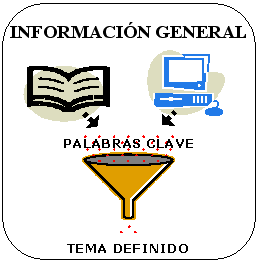 En la información general, tanto en libros como en Internet, podemos encontrar ideas o palabras clave relacionadas con el tema general de nuestro trabajo. Cuando las conseguimos, podemos combinar una o dos de ellas con el tema general. Al final obtendremos: Un tema definido y específico |