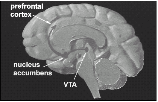 Figure 1.4: This drawing of a brain cut in half illustrates the brain areas and systems involved in the reward system, or pleasure circuit. Neurons in the ventral tegmental area (VTA) extend axons to the nucleus accumbens and part of the prefrontal cortex. Source: National Institute on Drug Abuse (1996) The Brain & the Actions of Cocaine, Opiates, and Marijuana. Slide Teaching Packet for Scientists.