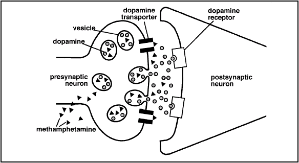 Figure 3.1: Methamphetamine alters dopamine neurotransmission in two ways. Methamphetamine enters the neuron by passing directly through nerve cell membranes. It is carried to the nerve cell terminals by transporter molecules that normally carry dopamine or norepinephrine. In the nerve terminal, methamphetamine enters the dopamine- or norepinephrine-containing vesicles and causes the release of neurotransmitter. Methamphetamine also blocks the dopamine transporter from pumping dopamine back into the transmitting neuron. Methamphetamine acts similarly to cocaine in this way.