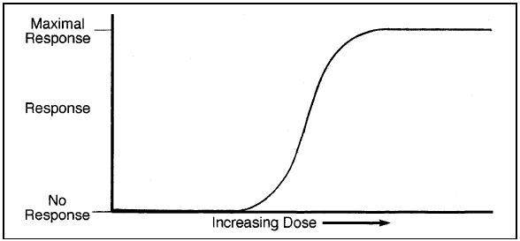 Figure 3.4: When the dose of a drug is low, no response is measurable. As the dose increases, the effect of the drug increases until it reaches a maximum. At high doses, the response to the drug remains at the maximum level.