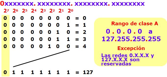 Para clase A, el primer bit del primer octeto se reserva para ser el bit inicial que identifica a la clase.
