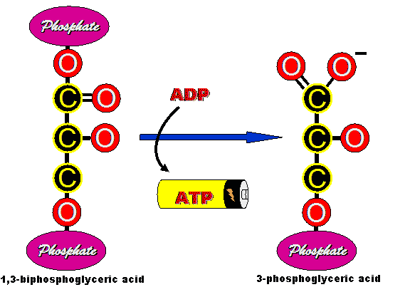 by the enzyme phosphoglycerate kinase, a molecule of ADP gets phosphorylated