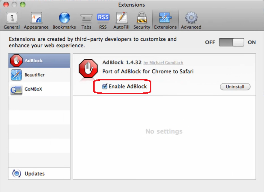 - Uncheck the Enable checkbox listed under the extension's name, or click Uninstall to remove the extensions completely.
