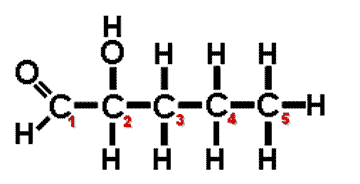| A(n) ______ carbon is a carbon atom that is attached to four different atoms or groups of atoms. The result is to allow for the possibility of another molecules that can be an enantiomer (mirror image) of the first molecule. | asymmetric carbon (In the diagram below, the #2 carbon is the asymmetric carbon. Even though it bonds to two carbons, the #1 carbon can be considered an aldehyde GROUP and the number #3 carbon can be considered a propyl group. Therefore, all 4 groups coming off the #2 carbon are different),  |