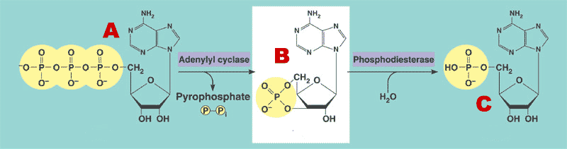 What is the name of the enzyme that converts ATP into cAMP.,  | Adenylyl cyclase,  |