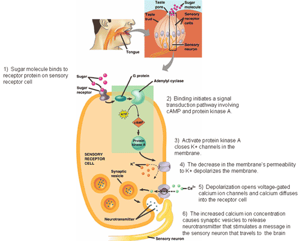 | In addition to using proteins, many signaling pathways also involve small, non-protein, water soluble molecules or ions called ___________. | second messengers (the picture below shows a pathway where the signal is sugar and the transduction pathway involves both cAMP and calcium ions),  |