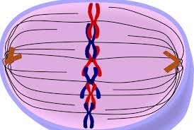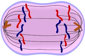 METAPHASE,  | The second phase of mitosis when spindle fibers align the chromosomes along the cell equator. |