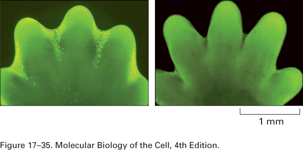 Which process is responsible for the separation of the digits in this developing mouse paw?,  | Apoptosis (programmed cell death - in this case, the cells between the digits die, causing the separation),  |