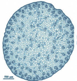 This cross section of an angiosperm stem is typical of (monocots or dicots).,  | Monocot (The vascular bundles of xylem and phloem are typically scattered and unorganized in monocots),  |