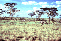 | TROPICAL SAVANNA-grasslands characterized by a cover of grasses, isolated trees, and small groves of trees and shrubs. |