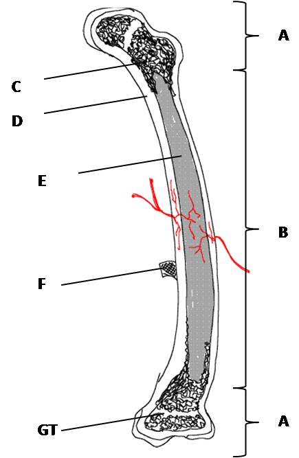 What type of bone is found at C?,  | Cancellous or Spongy |