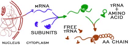 Sinteza proteina,  | iRNK izlazi iz jedra i u citoplazmi se spaja sa ribozomima |
