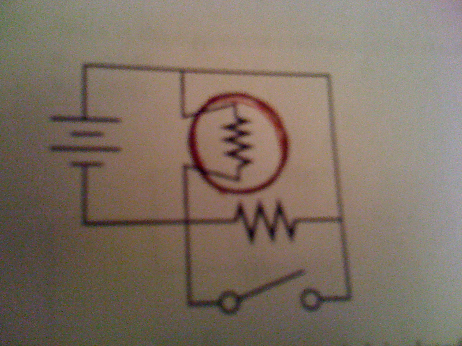 What happens when the switch is closed in the circuit shown? | Current from the battery glows through both the lamp and the resistor.,  |