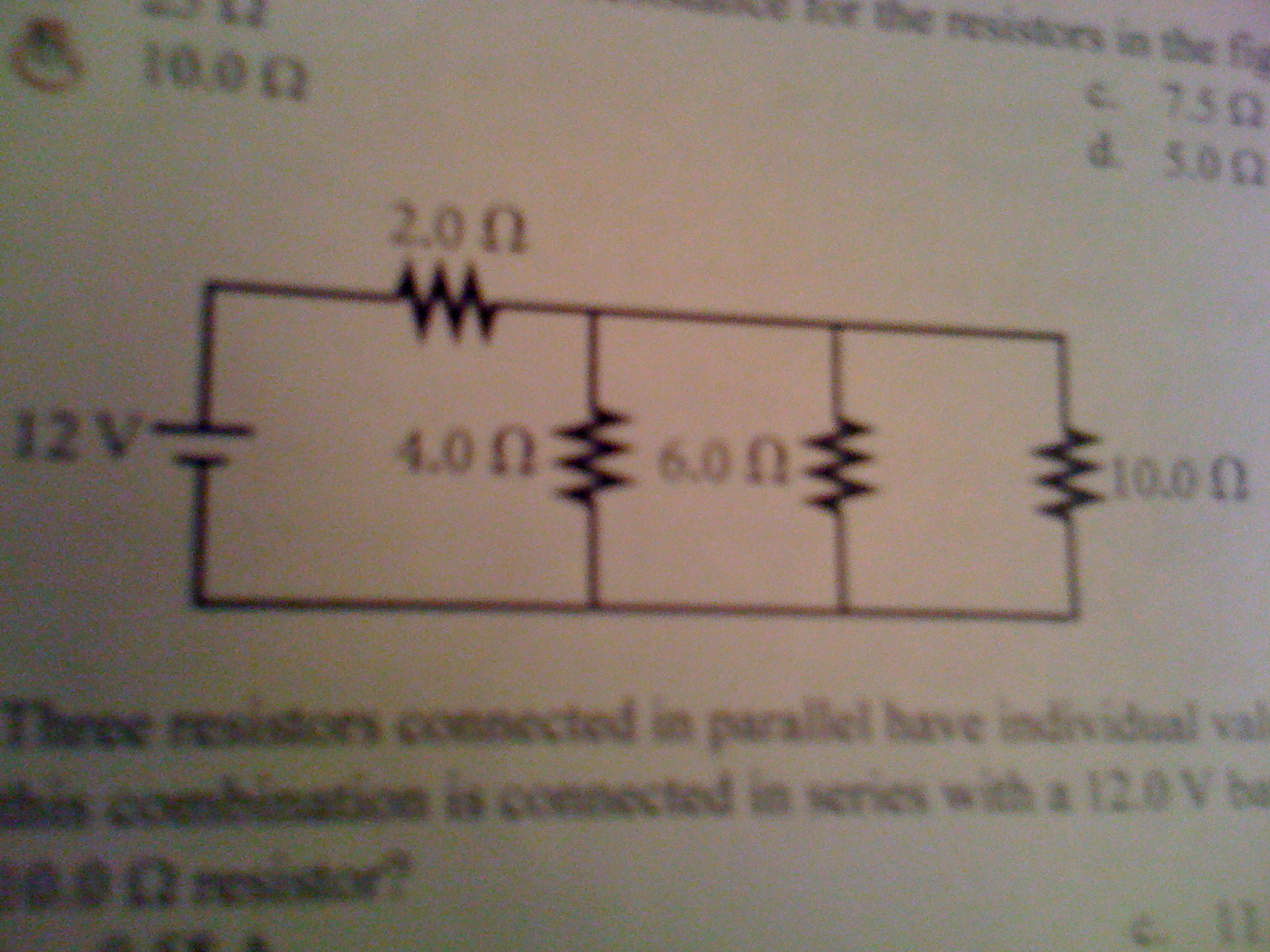 Three resistors connected in parallel have individual values of , 6.0Ω , and 10.0Ω , as shown. If this combination is connected in series with a 12.0 V battery and a 2.0Ω resistor, what is the current in the 10.0Ω resistor? | 0.58 A,  |