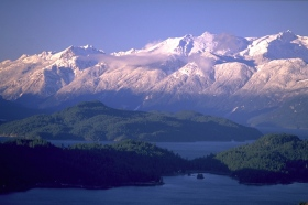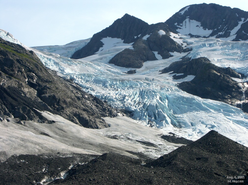 | glacier | large ice mass that moves slowly down a mountain or across land |