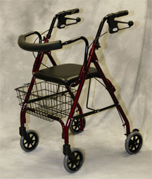 Rollator,  | has a padded seat, curved backrest, and loop brakes for quick and easy stopping. |
