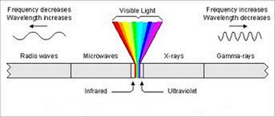 electromagnetic spectrum | all the wavelengths of visible and invisible light in order, from short (gamma rays) to long (radio) |
