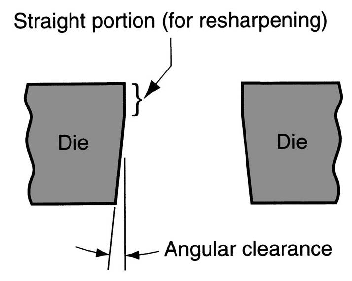 | Purpose of angular clearance | allows slug or blank to drop through die. Typical values: 0.25 to 1.5 degrees on each side,  |