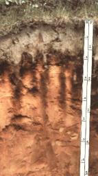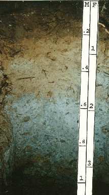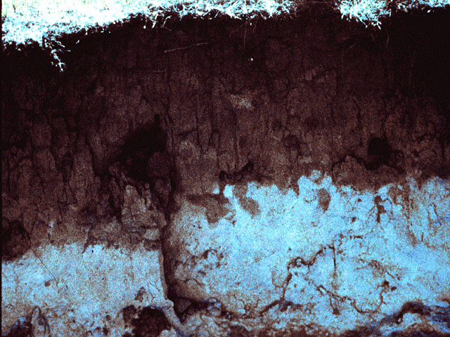 Spodosol | soil is commonly found in cool, moist environments under coniferous forest vegetation. Surface litter composed of pine needles breaks down in the presence of water to form a weak organic acid. Acidic soil water removes base ions in solution to create an acidic soil. Easily dissolved materials are leached from surface layers leaving behind the most resistant material like quartz creating an ashy-grey, near-surface layer. Layers at depth are stained with iron and aluminum oxides.,  |