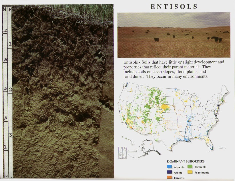 Entisol | soil are weakly developed soils that do not exhibit distinct horizons. Often found in recently deposited parent material, steep slopes, or other environments that inhibits soil development.,  |