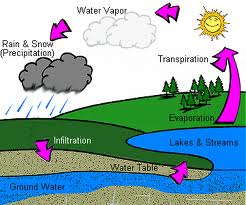 | water cycle | The process in which water circulates from the oceans to the clouds to the land to the rivers, and then accumulates back into the oceans.,  |
